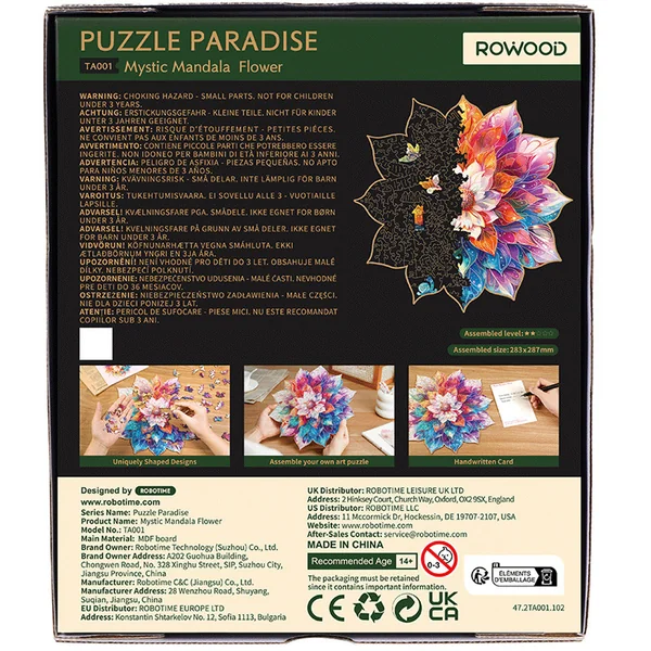 Toutes les pièces du puzzle sont découpées avec précision grâce à une technologie laser de pointe, ce qui leur permet de s’emboîter parfaitement. Fabriquées en bois de haute qualité, elles sont réutilisables, pour que vous puissiez profiter du plaisir de faire des puzzles à tout moment.
