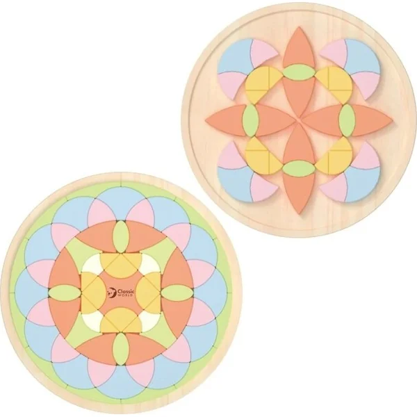 Les pièces colorées avec des angles précis et des couleurs harmonieuses permettent aux enfants de créer librement de magnifiques motifs symétriques rappelant des mandalas.