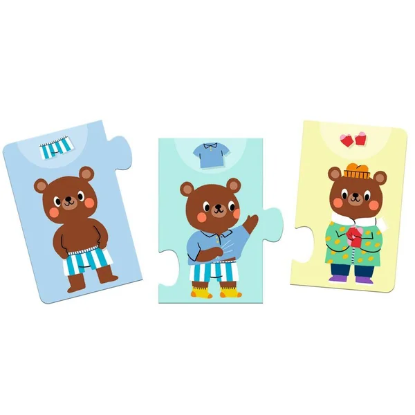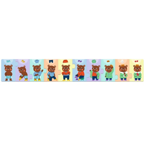 Nounours s’habille est un puzzle frise de 10 pièces à remettre dans l’ordre pour apprendre les étapes de l’habillement.