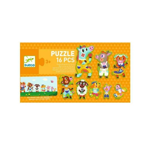 8 puzzles de 2 pièces silhouettées de différentes tailles forment 8 animaux rigolos de la ferme. Une fois réalisés, la carte-modèle indique comment les ranger, du plus grand au plus petit. Une toute première notion de grandeur !