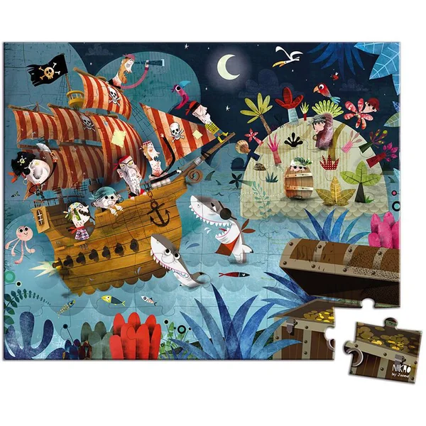 Ambiance nocturne et mystérieuse pour ce puzzle mettant en scène des pirates en quête d’or et d’argent ! Mais la tâche est rude et le chemin jusqu’au coffre semé d’embûches ! Les petits vont adorer ces illustrations et se mettre avec envie aux puzzles. Celui-ci est adapté aux enfants de 4 à 7 ans. Il contient un poster pour aider l’enfant. Fabriqué en France, produit FSC et à base d’encres végétales.