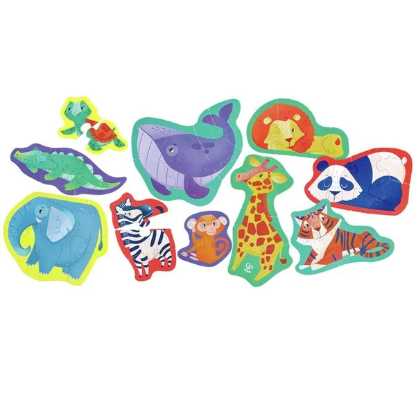 Découvre les nombreux animaux qui peuplent la nature en assemblant ces puzzles adaptés au développement de l’enfant, suivant leur nombre de pièces (de 2 à 6).