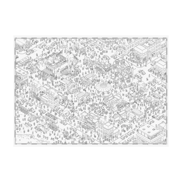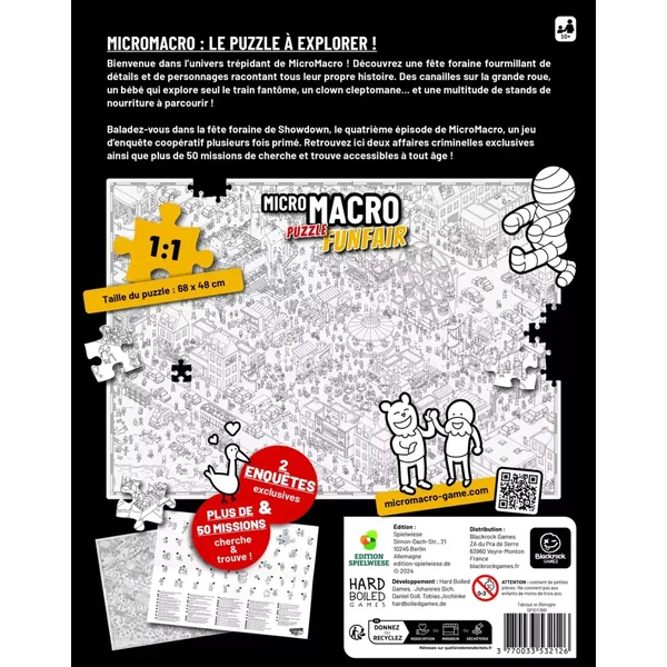 Puzzle Micro Macro Funfair est un puzzle rectangulaire en carton illustré par Hard Boiled Games, enquêtes de Johannes Sich, et édité par Spielwiese. Puzzle de 500 pièces. Dès 10 ans. Vous découvrirez le plan détaillée du quartier de MicroMacro Showdown, offrant une vue d’ensemble des ruelles et de la zone de la Fête foraine.