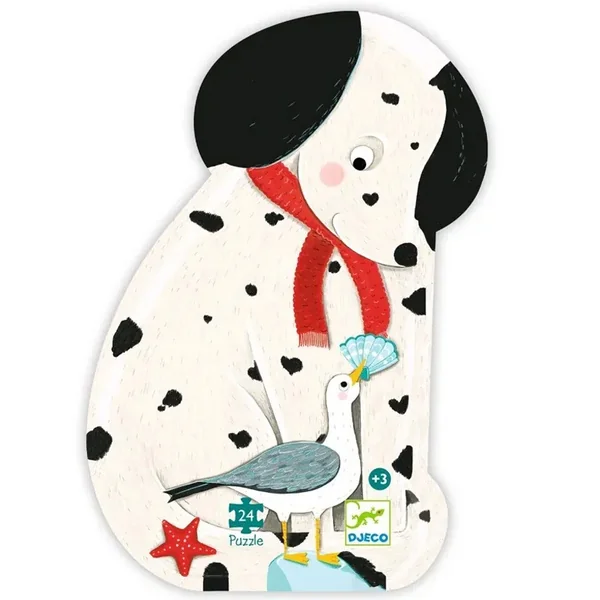 Ollie, le dalmatien part passer la journée à la plage avec ses parents. Ce puzzle coloré de 24 pièces est présenté dans une jolie boîte silhouette en forme de chien.