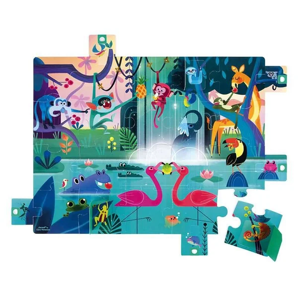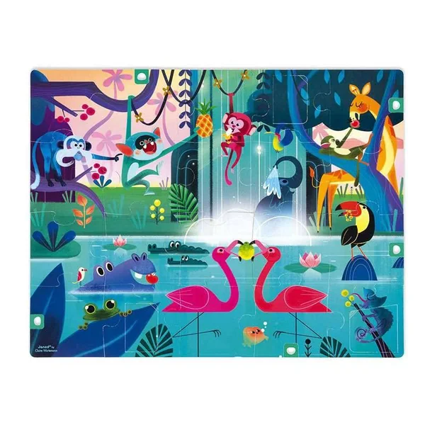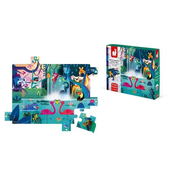 5 languettes à tirer, pour agrandir le puzzle et 3 fenêtres à ouvrir pour découvrir pleins de surprises cachées dans cette illustration de la jungle.