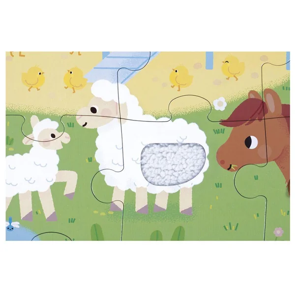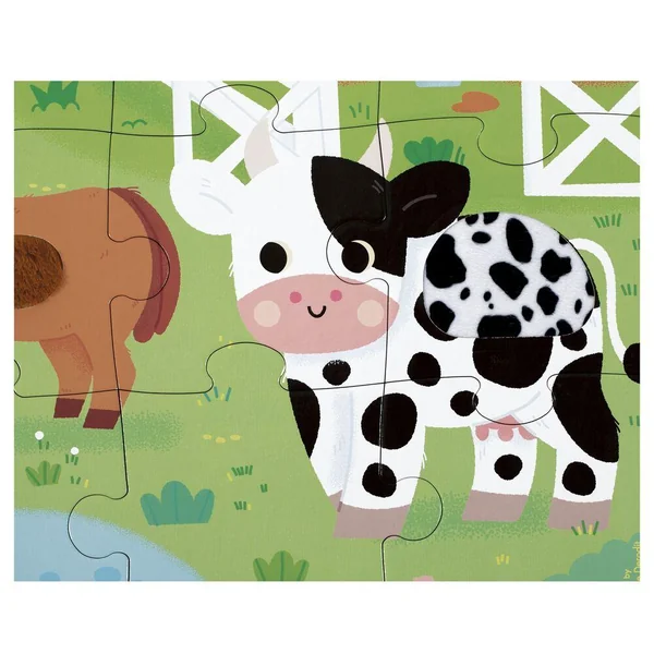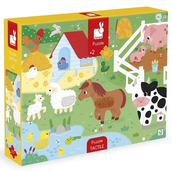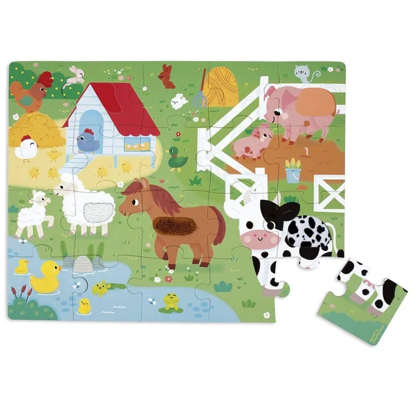 Amusez-vous à découvrir les animaux de la ferme avec ce puzzle tactile géant ! A l’aide du poster inclus, l’enfant pourra assembler ce joli puzzle composé de 20 pièces, dont 7 sont texturées. Il découvrira les différentes matières/textures sur le puzzle, ce qui favorisera le développement du toucher et de la motricité fine. Puzzle en carton FSCTM, pour les enfants à partir de 2 ans.