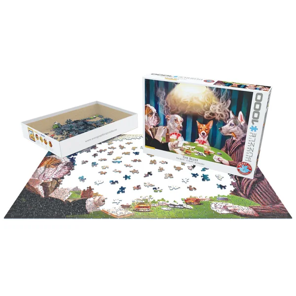 • The Bluff, de l’artiste Lucia Heffernan, est une illustration humoristique représentant quatre chiens. Assis autour d’une table de jeu de cartes, ils jouent au poker en buvant des cocktails et de la bière, tout en fumant cigarettes et cigares.