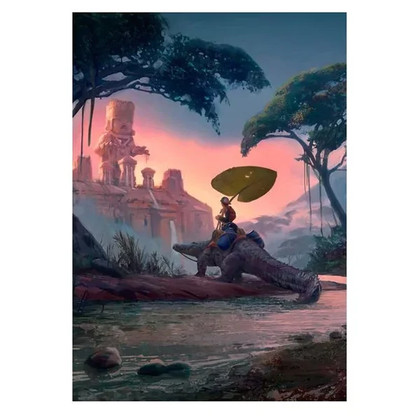 Méfiez-vous de ce thème chaleureux et rassurant. Certes, ce Mowgli des temps modernes semble contrôler les choses… mais il n’en demeure pas moins qu’il chevauche un… alligator. Ce puzzle se distingue par ses éléments qui se mêlent les uns aux autres dans une multitude de tons verts et bruns, les rendant dangereusement indissociables. Heureusement, l’arrivée du soleil sur le temple ramène de la chaleur à la scène, facilitant ainsi la prise de repères.