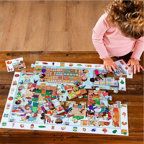 Une fois que les plus petits auront assemblé le puzzle, ils pourront observer les détails et retrouver les différents éléments du cadre extérieur dans la scène du marché.