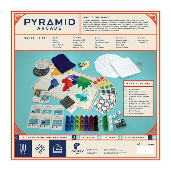 Entrez dans un monde de possibilités infinies avec Pyramid Arcade, la collection ultime de jeux de table. Dans cette boîte colorée, vous trouverez tout ce dont vous avez besoin pour jouer à 22 jeux uniques, chacun utilisant des pyramides colorées de manière innovante et passionnante. Des jeux rapides et simples accessibles dès 8 ans aux défis stratégiques plus profonds pour les joueurs expérimentés, Pyramid Arcade propose une expérience adaptée à tous les âges et niveaux.