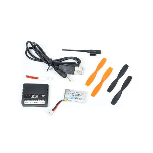 Mini-OVNI RC équipé de 4 micro-moteurs et d’un gyro 6 axes. Emetteur 4 voies 2.4GHz.