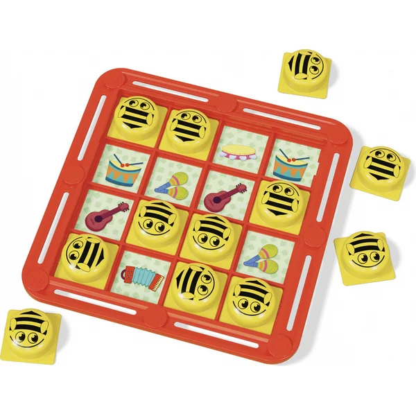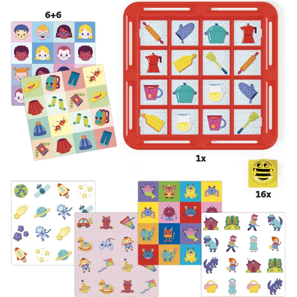 - 1 grille jaune, 16 jetons de couverture jaunes avec le motif d’une abeille, 6 cartes illustrées recto-verso.