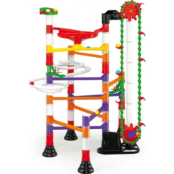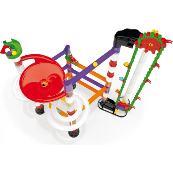 Le jouet développe la créativité et la pensée logique, qui sont essentielles pour construire de magnifiques, mais surtout fonctionnels, parcours avec la bonne inclinaison. Le kit comprend un nouvel élément spécial – un ascenseur – utilisant des pièces du kit de construction. Le parcours de billes est un jouet éducatif intelligent qui enseigne aux enfants les bases des lois physiques de la gravité et de la mécanique. Le jouet est fabriqué à partir de matériaux conformes aux normes de sécurité internationales.