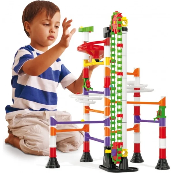 Créez votre propre parcours de billes grâce à notre incroyable kit de construction. Construisez les modèles représentés sur la boîte ou amusez-vous à expérimenter avec vos propres designs. Tous les toboggans, ponts, poteaux, roues à aubes, spirales et entonnoirs s’emboîtent les uns dans les autres, vous offrant une infinité de combinaisons et garantissant un amusement prolongé.