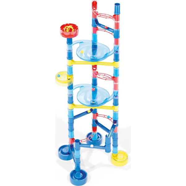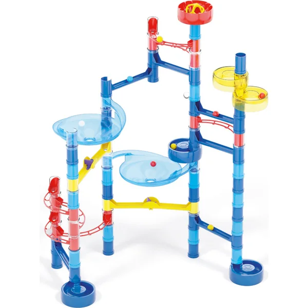 Contenu de l’emballage : 2 pièces de départ, 6 courtes pistes droites, 7 pièces courbes, 1 entonnoir, 2 aiguillages, 50 poteaux (colorés et transparents), 10 pièces de bases/escargots, 2 bouchons en EVA, 12 billes colorées.