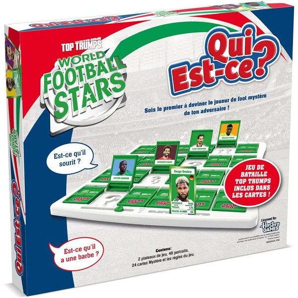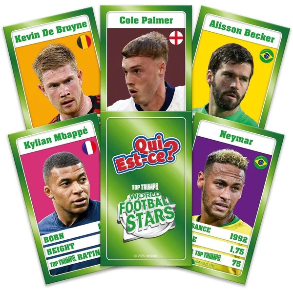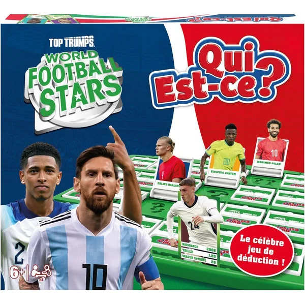 Le célèbre jeu de déduction arrive dans l’univers Wold Football Stars ! Retrouve tes joueurs préférés et tous ses adversaires coéquipiers dans ce QUI EST CE? WORLD FOOTBALL STARS et tente de deviner le personnage mystère que cache ton adversaire. 24 personnages issus des meilleurs clubs t’attendent dans ce jeu de société, tels que Cole Palmer, M’Bappé, Vinicius, Mohammed Salah ou encore De Bruyne. Assure-toi de poser les bonnes questions pour gagner la partie !