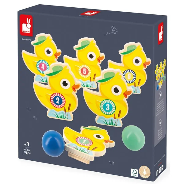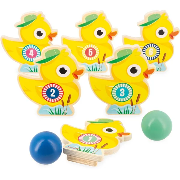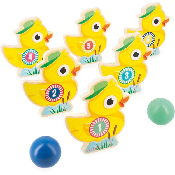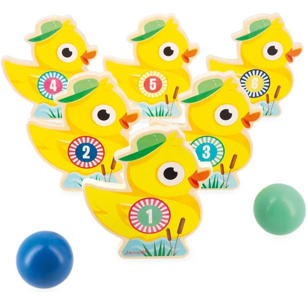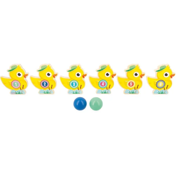 La chasse aux canards est ouverte ! Qui sera le plus habile et réussira à faire tomber le plus de canards avec les 2 boules en bois ? Ce jeu de quilles en bois, en forme de canards, numérotées de 1 à 6, est idéal pour amuser toute la famille. Développe la coordination main-œil des plus petits. Jeu d’adresse en bois FSCTM pour les enfants à partir de 3 ans. Pour 1 joueur et plus.