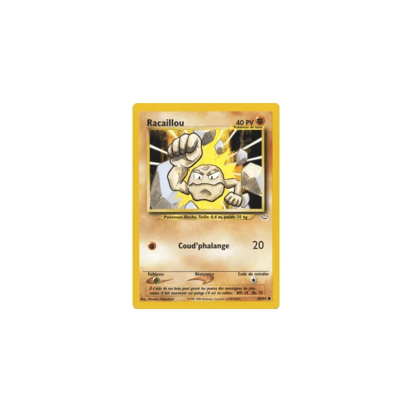 Découvrez Racaillou (nr044), une carte Pokémon de l’extension Neo Revelation, provenant du bloc Wizards. Idéale pour compléter votre collection, cette carte Commune plaira autant aux collectionneurs qu’aux joueurs.