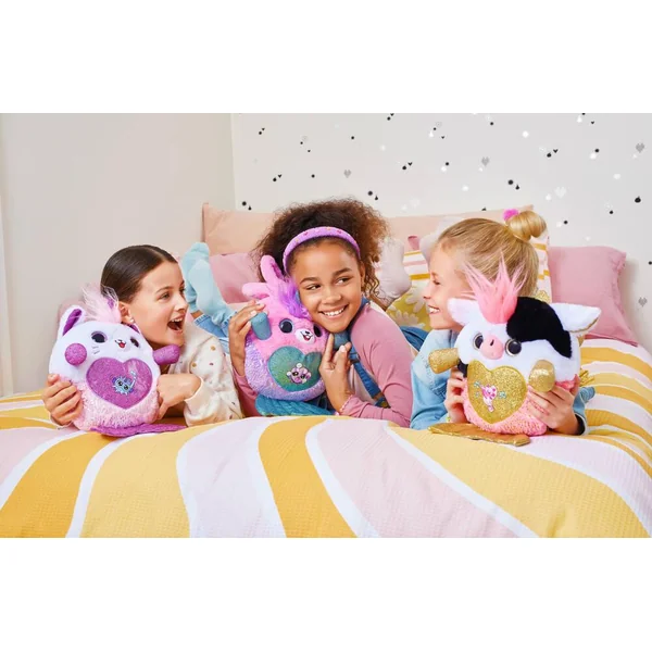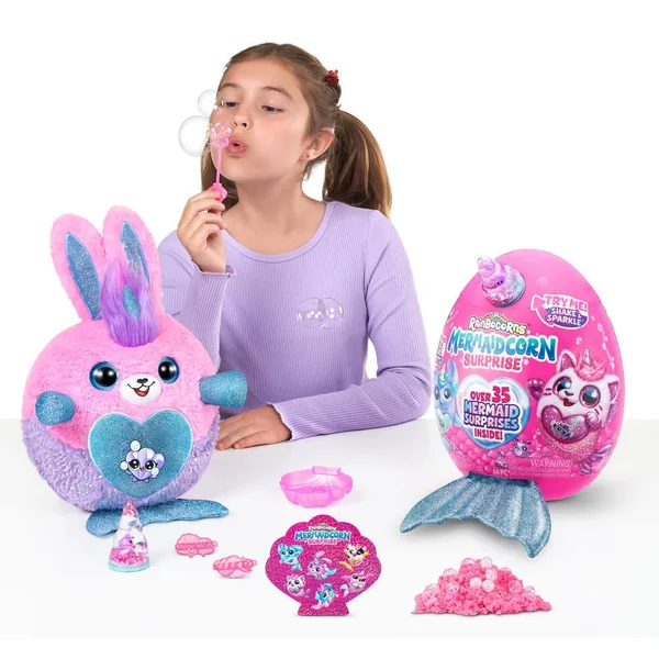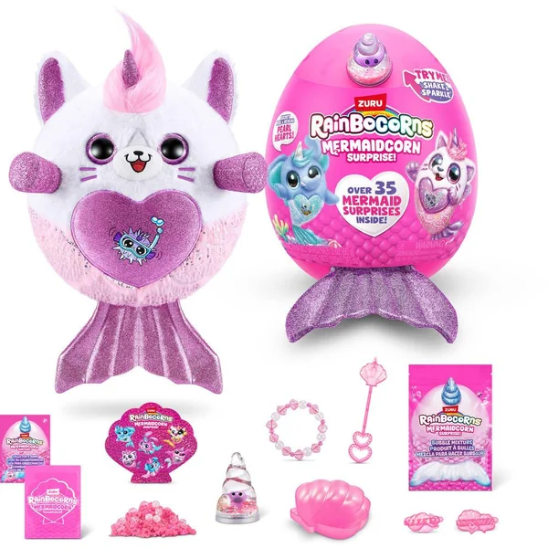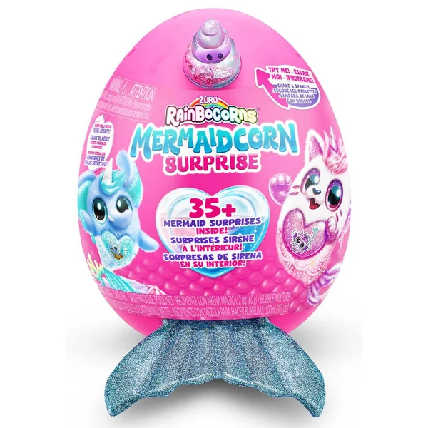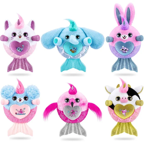 Ces Mermaidcorns sont prêtes à faire sensation à Rainboville! Faites éclore votre œuf pour déballer votre nouvel ami fantaquatique et plus de 35 surprises! Ces peluches douillettes viennent avec une queue de sirène brillante et un boo-boocorn caché à l’intérieur d’un globe d’eau en forme de corne! Il y a 6 Mermaidcorns à collectionner, chacune avec un cœur à peler qui révèle ce que votre Mermaidcorn aime! Explorez Mermaid Cove et trouvez votre nouvelle amie câline!