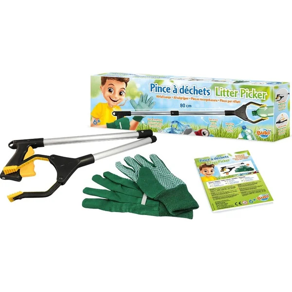 Les mâchoires peuvent saisir des bouteilles en PET jusqu’à un diamètre de 10 cm. Une fois replié, la longueur du ramasse-déchets n’est que de 40 cm. Des gants de taille enfant sont inclus. Convient pour l’éducation écologique et des usages pratiques courants.