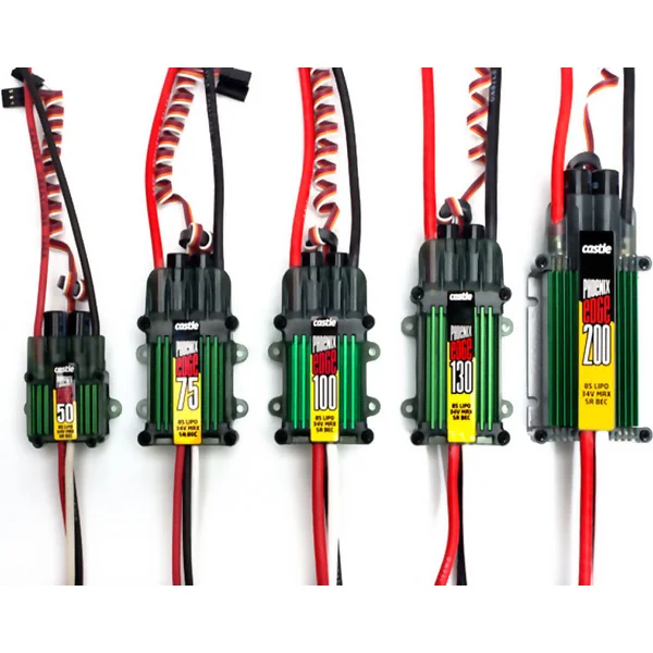 Le régulateur de pointe Phoenix Edge 50 de Castle Creations est conçu pour les hélicoptères de taille 450 ou pour les avions de taille .25 à .35. Alimentation par batteries LiPo de 2 à 8 cellules, courant continu max. 50 A. Pour un bon circuit de chaleur généré dans les transistors, le régulateur est équipé d’un grand dissipateur thermique sur son circuit.