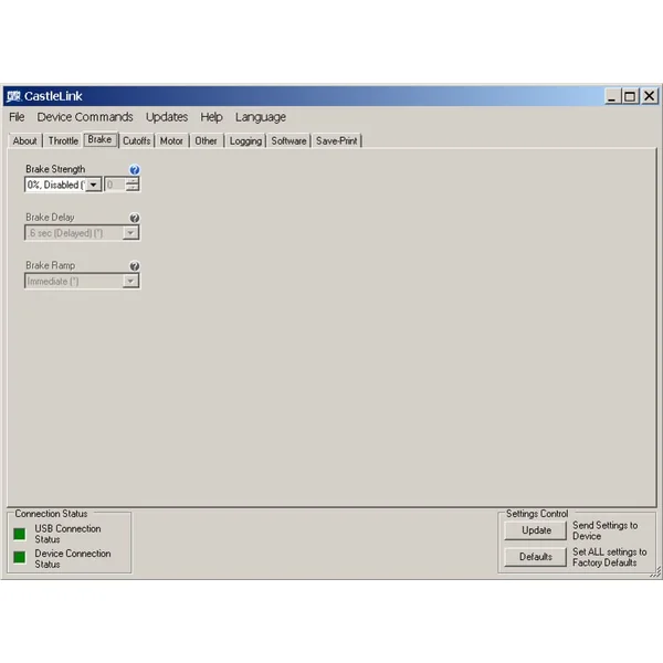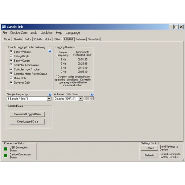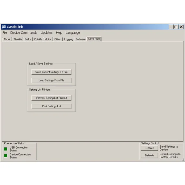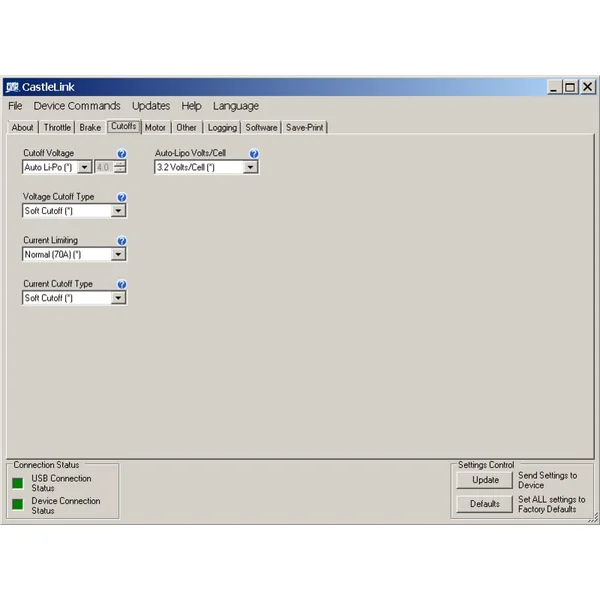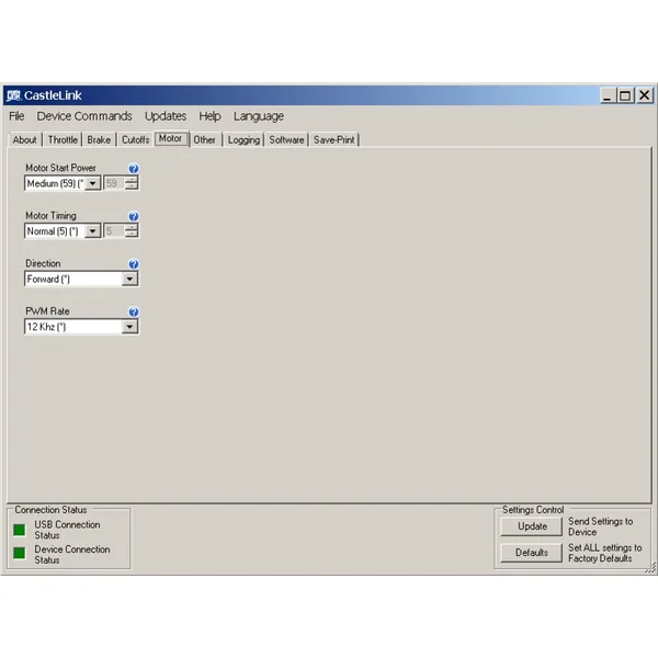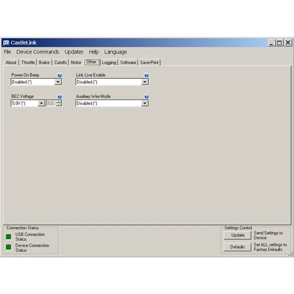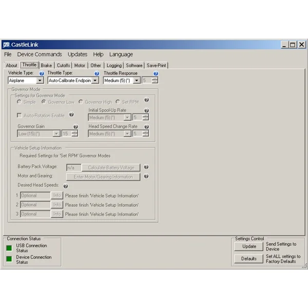 Les paramètres de base du régulateur peuvent être programmés à l’aide du levier de gaz de l’émetteur ou d’une carte de programmation. Tous les paramètres du régulateur sont ensuite programmés via l’application Castle Link disponible gratuitement pour les ordinateurs fonctionnant sous Windows. Le régulateur se connecte à l’ordinateur via un convertisseur spécial dans le port USB. Pour une connexion plus facile du convertisseur USB, nous recommandons d’acheter le câble de programmation Quick Connect.
