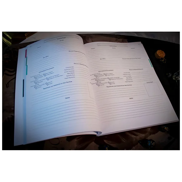 Ce carnet de travail contient plus de 200 pages d’espaces de notes classifiés, de références et de suggestions de brainstorming pour aider les Maîtres de Jeu à construire, gérer et organiser leurs mondes. Créez des villes, des PNJ et des quêtes en toute simplicité, suivez l’évolution des personnages des joueurs, consignez les sessions de votre groupe et bien plus encore !