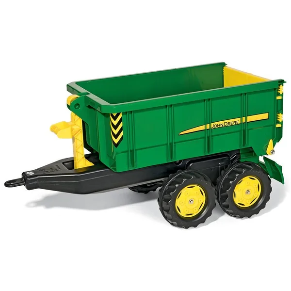 Benne-container amovible à grande capacité de chargement grâce au double essieux. Portes arrières fermées par crochets. Bras articulé pour basculer et vider la benne ou alors simplement la déposer. De couleur verte.