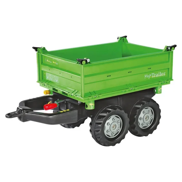 Remorque RollyMega Trailer à benne basculante sur trois côtés et double essieux, pour enfants à partir de 3 ans. Grande remorque à haute capacité de charge. Le basculement se fait par simple changement de 2 boulons de sécurité, extrêmement stable et résistant. De couleur verte.