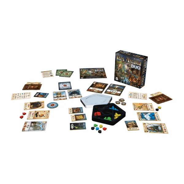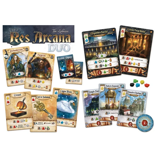 Res Arcana Duo est à la fois une extension pour Res Arcana et un jeu autonome pour deux joueurs, pouvant être combiné avec les extensions Lux et Tenebrae et Perlae Imperii de Res Arcana.