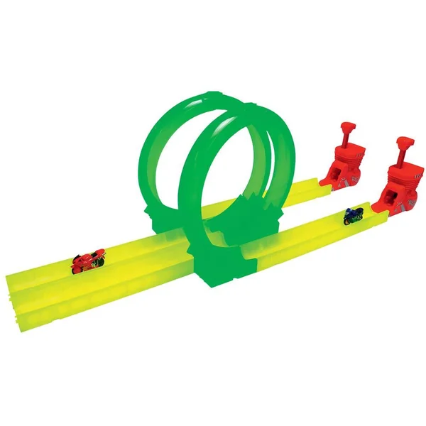 Le kit parfait pour des courses endiablées ! Avec 2 lanceurs, 2 motos et 2 loopings, les motos fuseront à toute allure sans pouvoir s’arrêter ! Elles peuvent effectuer des acrobaties en tout genre !