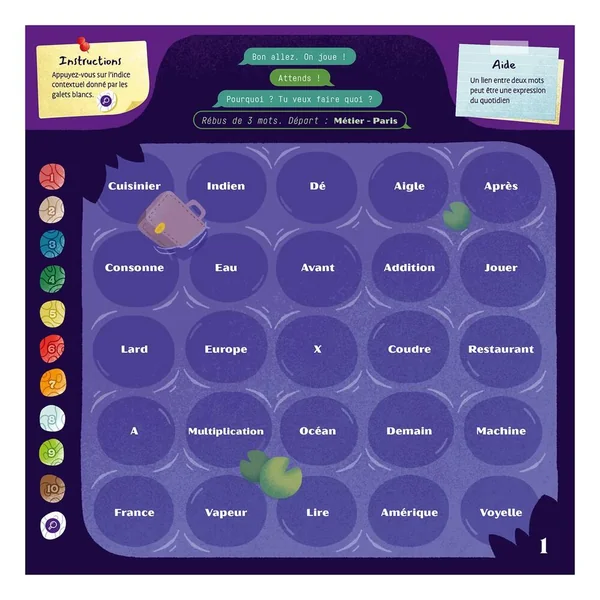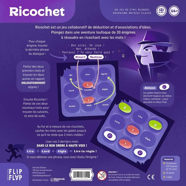 Suivez les aventures d’agents secrets loufoques dans une succession d’énigmes originales à résoudre seul ou à plusieurs. En utilisant les associations d’idées, faites des ricochets de mot en mot pour trouver le bon chemin et résoudre le rébus final ! Nombre de joueurs 1 et +