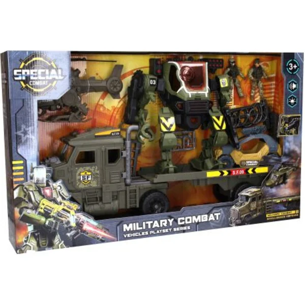 Robot Mecha avec effets – ensemble avec camion et hélicoptère offre aux enfants un jeu militaire palpitant plein d’action et d’aventure. Le robot émet des effets lumineux et sonores qui animent le jeu et développent l’imagination.