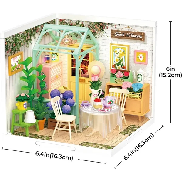 RoboTime Miniature maison Sieste avec thé dans un jardin fleuri