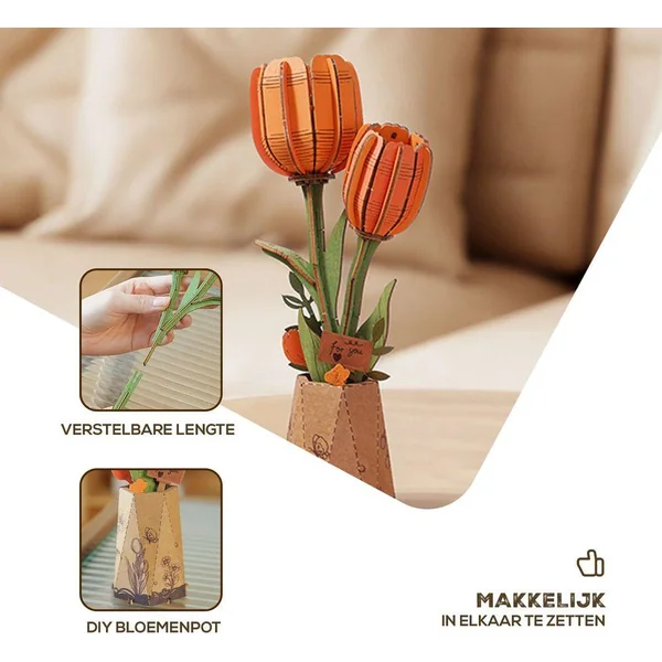 TW081 représente une tulipe orange, vibrante et pleine d’énergie. Ce puzzle 3D en bois est idéal pour les amateurs de fleurs colorées et de créativité.