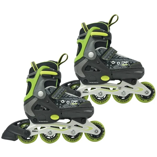 Rollers en ligne, réglables par bouton poussoir pour l’initiation et le perfectionnement. Serrage de la chaussure par laçage (blocage lacet intégré), boucles crantées à 2 têtes, fermetures sécurisées avec clip. Chaussons intérieurs réglables en taille, mousse grand confort, et languettes renforcées. Pied droit équipé d’un frein arrière caoutchouc. Châssis composite à 4 roues. Roues PU coulé, profil convex. Taille 70 x 24 mm. Roulements ABEC 7. Rollers de classe B : destinés aux patineurs dont le poids est compris entre 20 et 60 kilos, et dont la longueur du pied n’excède pas 260 mm. Kit de maintenance inclus : 1 frein et 1 axe court, vis de rechange et 2 clés embout Hex. Taille : 35-38.