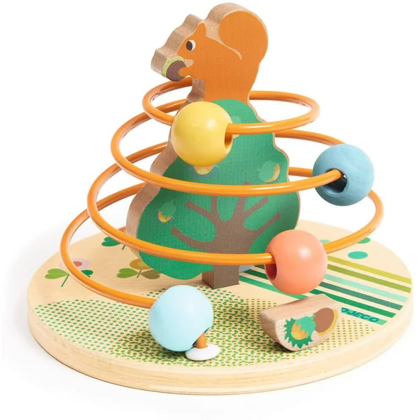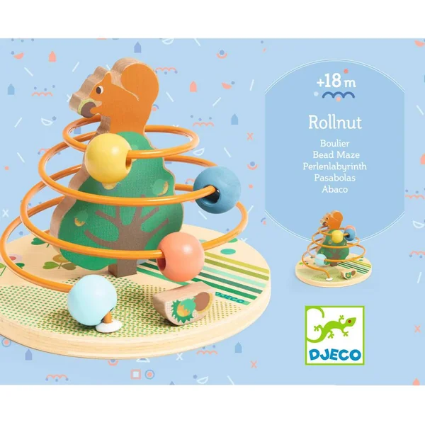 RollNut est un boulier en bois destiné aux enfants à partir de 18 mois. Il se compose d’une tige métallique en forme de cône sur laquelle 4 perles se déplacent. L’enfant s’amuse à faire glisser, tourner, monter, redescendre les perles de différentes couleurs dans un mouvement circulaire tout au long de la tige pour relier l’écureuil à ses noisettes.