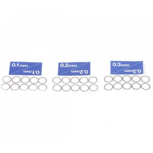Ce set comprend 10 rondelles d’une épaisseur de 0,1 mm, 10 de 0.2mm et 10 de 0,3mm. Ces rondelles de callage peuvent être utilisées pour réduire le patinage de la suspension ou de l’axe de roue dans tous les véhicules Tamiya sur et hors route. Parfait pour affiner la construction de votre voiture de course.