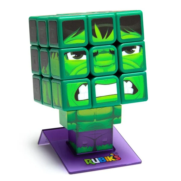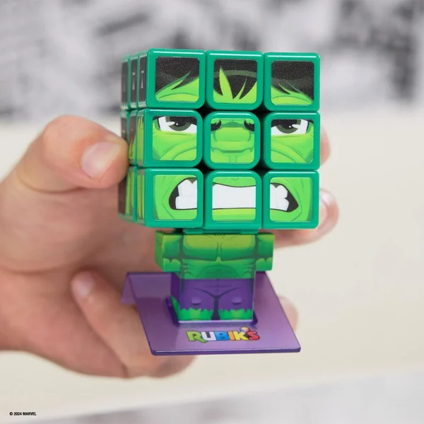Le Rubik’s 3X3 sous licence Hulk : à résoudre et à exposer. Identification des facettes via motifs en surimpression. Le corps du super héros est un socle d’exposition.