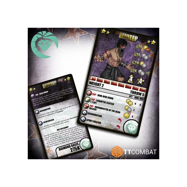 Ces superstars sans âme sont à ne surtout pas sous-estimer.Emotep est le spécialiste du grappling. Son mouvement signature, le Canoptic Clutch, ne laisse aucune chance à ses adversaires. Mais attention : son attaque Hom-Dive Bomb inflige 4 Dégâts et, combinée à sa Régénération, fait de lui un combattant redoutable, même contre les plus massifs.
