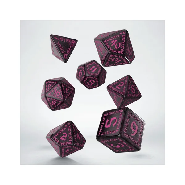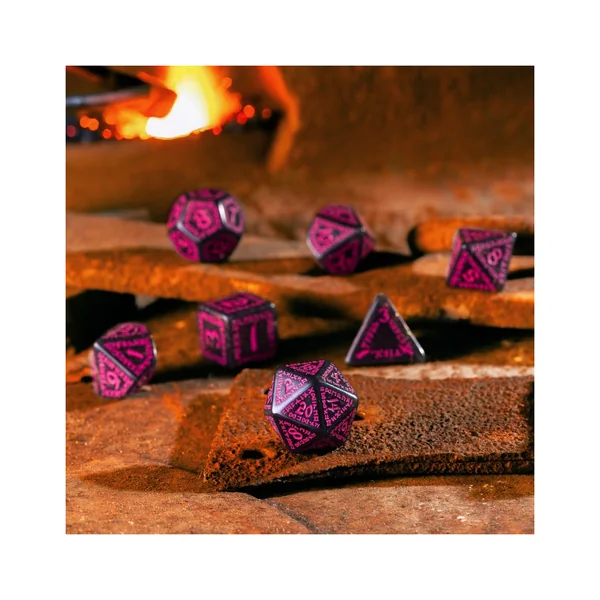 Le matériau noir étincelant, incrusté de poussière scintillante, s’allie à des gravures magenta pour créer un contraste mystique, tel des inscriptions magiques sur une pierre d’obsidienne. Le motif runique classique et intemporel garantit un style unique et une lisibilité parfaite. Ce set de 7 dés incarne une fusion de magie, de précision et d’un savoir-faire d’exception.