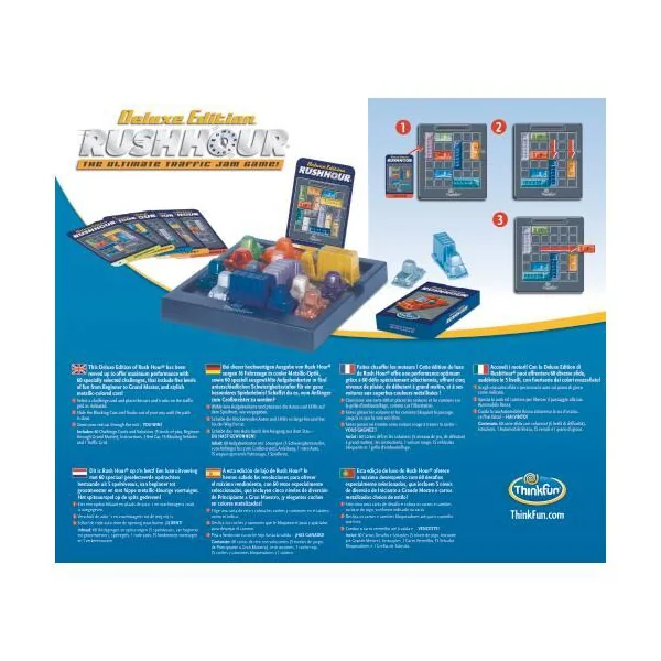 Faites chauffer les moteurs ! Cette édition de luxe de Rush Hour® offre une performance optimum grâce à 60 défis spécialement sélectionnés, offrant cinq niveaux de plaisir, de débutant à grand maître, et à ses voitures aux superbes couleurs métallisées ! 1. Choisissez une carte de défi et placez les véhicules sur le plateau de la manière indiquée sur l’illustration. 2. Déplacez les véhicules qui bloquent la voiture rouge de haut en bas, de gauche à droite, et vice-versa, pour libérer le passage.3. Faites passer votre voiture rouge en trombe et c’est gagné !