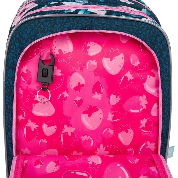 Nous recommandons de placer les manuels scolaires ou les classeurs les plus lourds dans le large compartiment arrière et d’alléger progressivement vers le dos. Le compartiment avant est un peu plus étroit, à l’intérieur se cache une petite poche en filet zippée et une étiquette.
