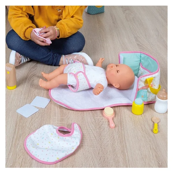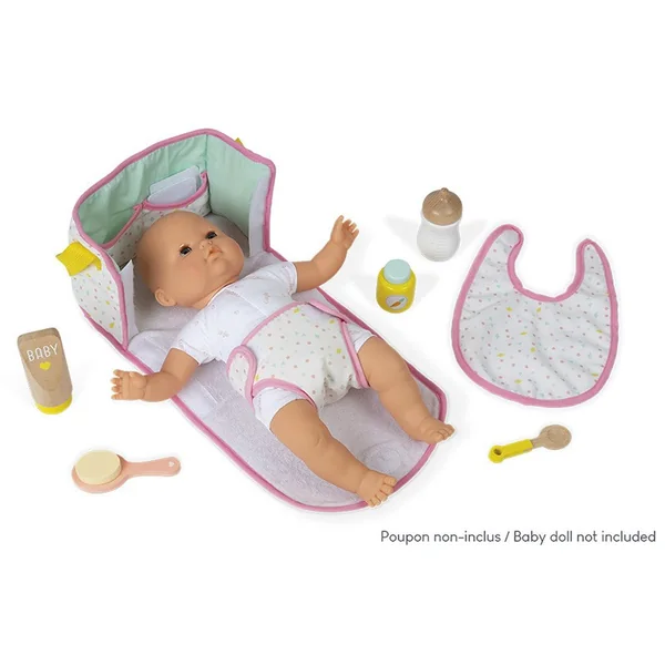 Ce jouet aux nombreux accessoires est adapté aux enfants à partir de 2 ans. Donner à manger à son poupon, lui faire sa toilette ou le changer, les journées seront chargées pour nos apprentis parents ! Le sac comporte de multiples poches à l’intérieur et se déplie pour se transformer en table à langer où l’enfant pourra installer confortablement son poupon sur le tissu éponge. 8 accessoires sont inclus.