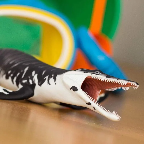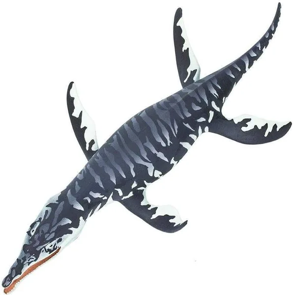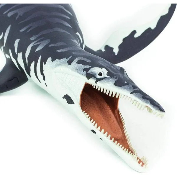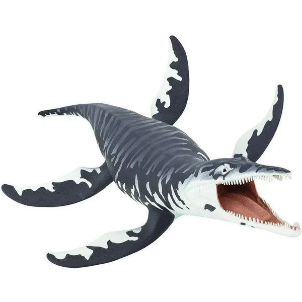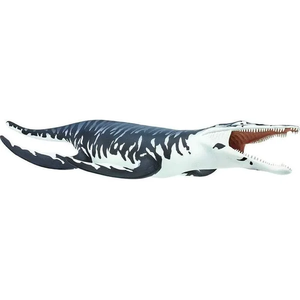 Le Kronosaurus carnivore avait une énorme tête avec des rangées de dents coniques et pointues dans de longues mâchoires, comme vous pouvez le voir sur notre figurine. Il avait un cou court, un corps robuste et deux paires de grandes nageoires en forme d’ailes qu’il utilisait pour se propulser dans l’eau. Ce reptile marin atteignait une longueur allant jusqu’à 33 pieds (environ 10 mètres).