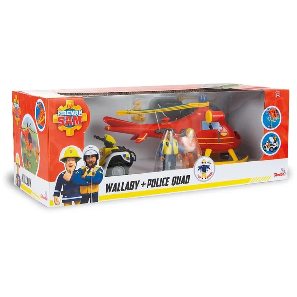 Pack contenant 1 hélicoptère Wallaby 1 et 1 Quad de police. L’hélicoptère possède des fonctions sonores et lumineuses. Le système électronique de l’hélicoptère permet de déclencher le gyrophare, le projecteur, et la sirène. Les hélices sont mécaniques.