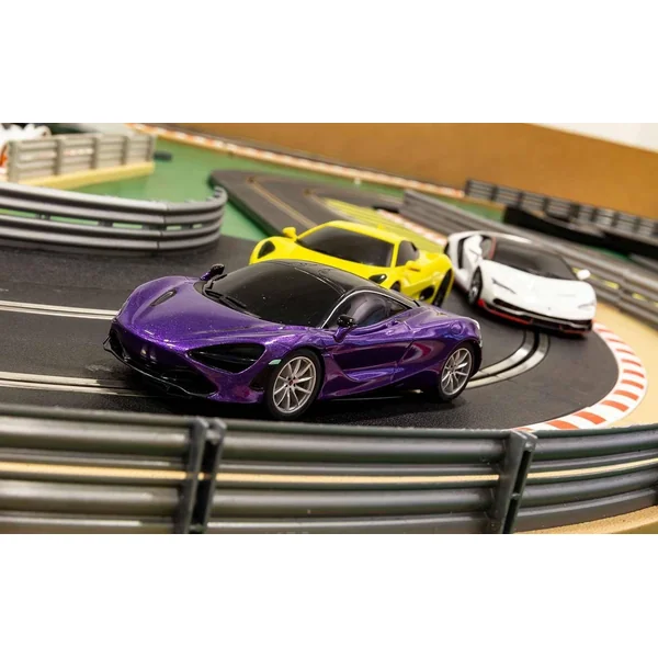 Circuit électrique scalextric avec jusqu’à 6 voitures sur les rails au même moment afin de réaliser des courses endiablées et reproduire des scènes mythiques des plus grandes courses automobiles.