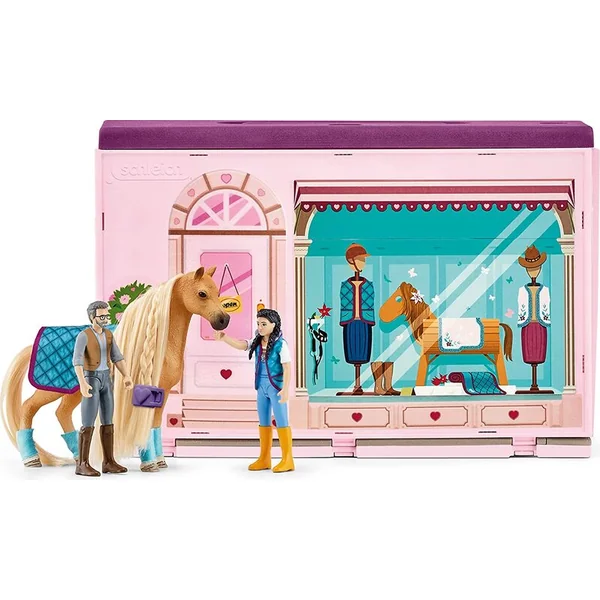 - Le set comprend : 1× valise portable pour jouets avec l’équipement suivant : 1× Quarter Horse avec crins et queue brossables, 1× figurine entièrement mobile de M. Mitchell, 1× figurine entièrement mobile de Kim, 1× boutique, 1× miroir, 1× 2× étagère, 1× support, 1× plante en pot, 1× grande boîte de vente, 1× petite boîte de vente, 2× chapeau d’équitation, 1× pinces à crins, 1× colliers à crins, 1× bandeau, 2× couverture pour chevaux, 2× courte couverture pour chevaux, 1× manchons, 1× caisse enregistreuse, 1× trophée.