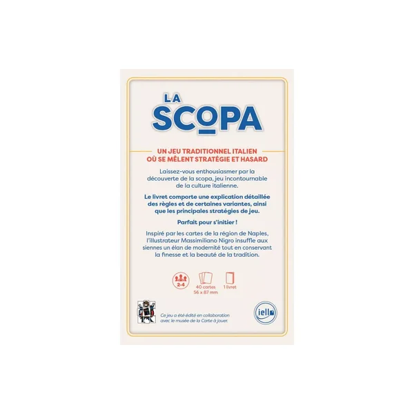 La Scopa : Massimiliano Nigro – Cartes Traditionnelles Iello contient : 40 cartes 56 x 87 mm et 1 livret qui comporte une explication détaillée des règles et de certaines variantes, ainsi que les principales stratégies de jeu.