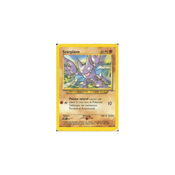 Découvrez Scorplane (nde067), une carte Pokémon de l’extension Neo Destiny, provenant du bloc Wizards. Idéale pour compléter votre collection, cette carte Commune plaira autant aux collectionneurs qu’aux joueurs.